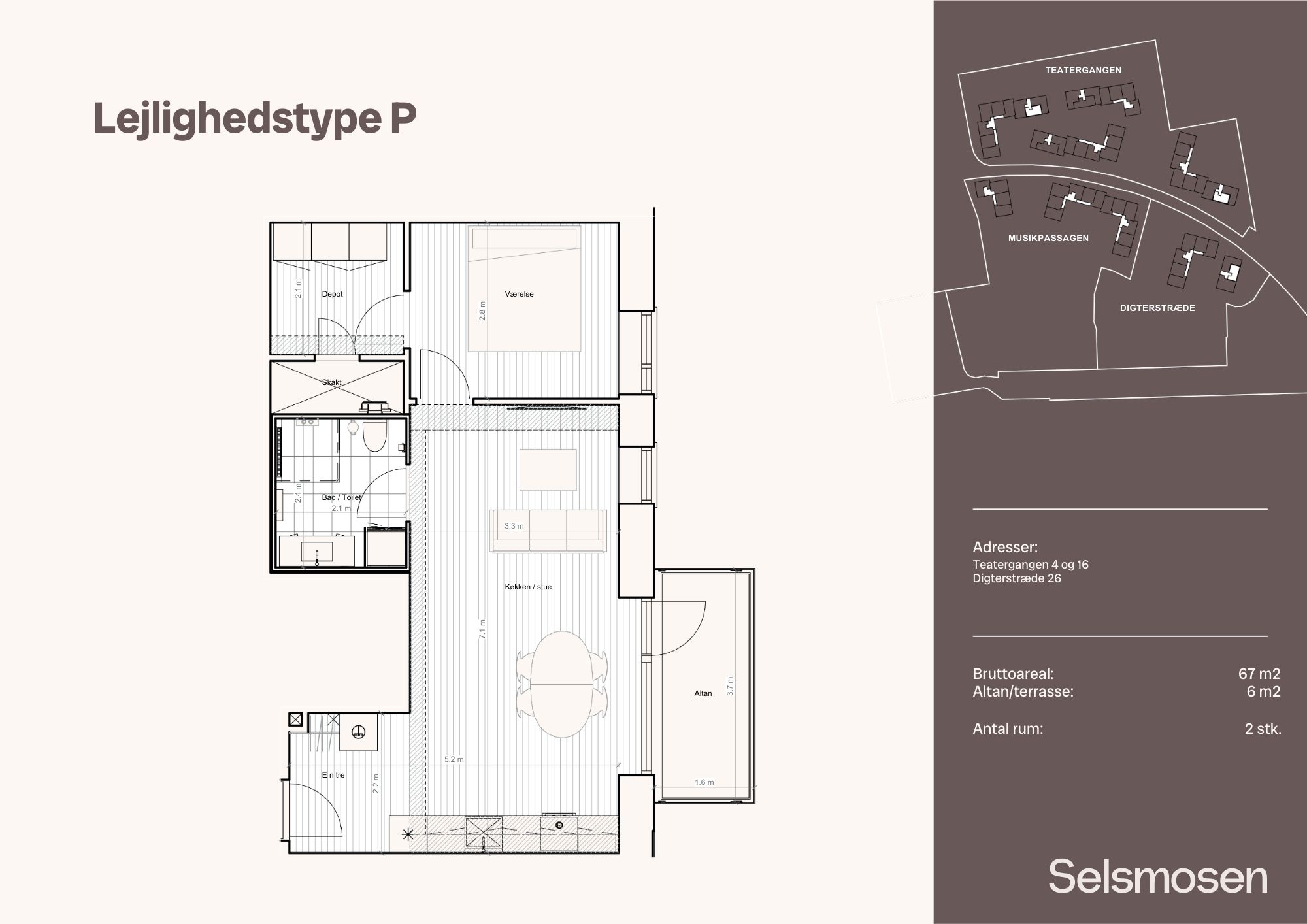 Velindrettet og lys 2’er på 67 m². Køkken-alrum i åben forbindelse, stort soveværelse, stilfuldt badeværelse og masser af naturligt lys hele dagen. Boligen er opført med svanemærkede og indeklimacertificerede materialer.