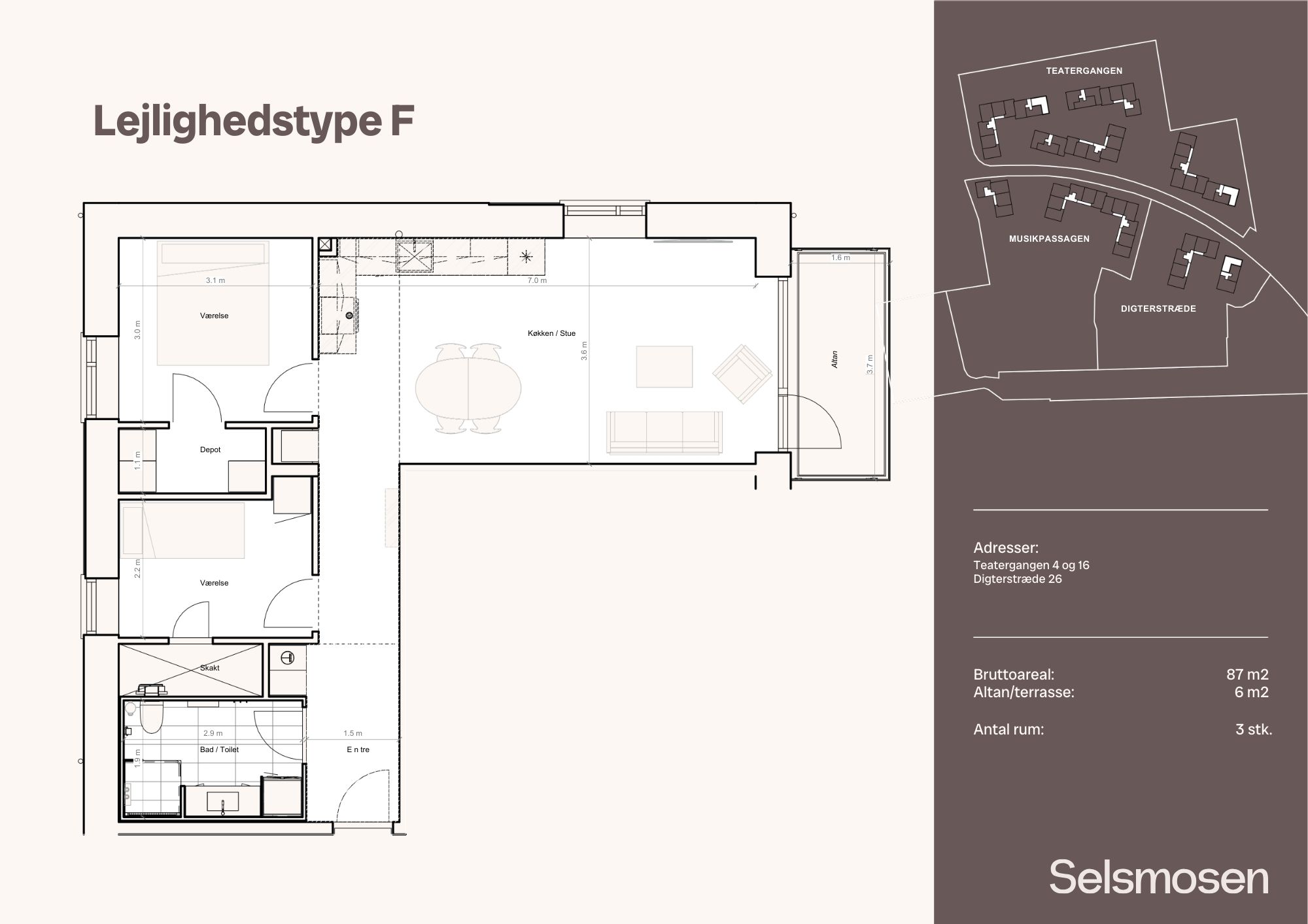 En moderne 3-værelses gavl-lejlighedpå 87 m² med alt det, en familie har brug for – og lidt til. To skønne værelser med god opbevaringsplads, et velindrettet badeværelser og et åbent køkken-alrum, der skaber flow og sammenhæng i boligen. Fra stuen åbner døren til en hyggelig altan, hvor der er plads til både afslapning og udeliv. Boligen er opført med svanemærkede og indeklimacertificerede materialer.