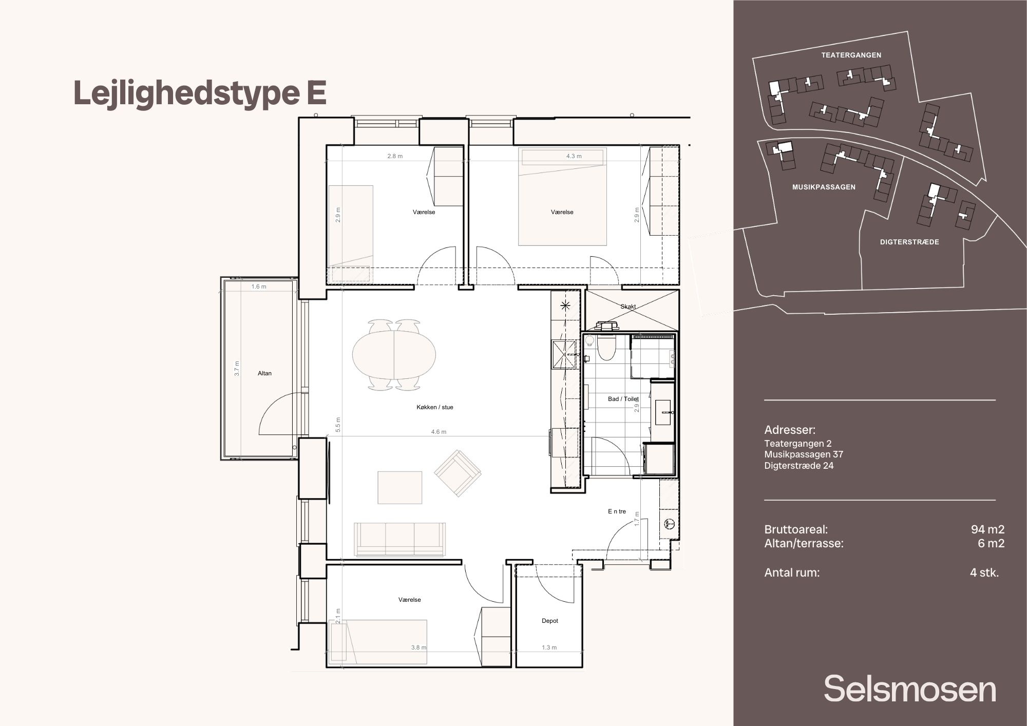 Bemærk at billederne kan være af en tilsvarende boligtype, hvorfor vi henviser til plantegningen og altid opfordrer til du oplever lejemålene ved selvsyn. Materialerne er dog de samme i alle enheder, med små variationer.