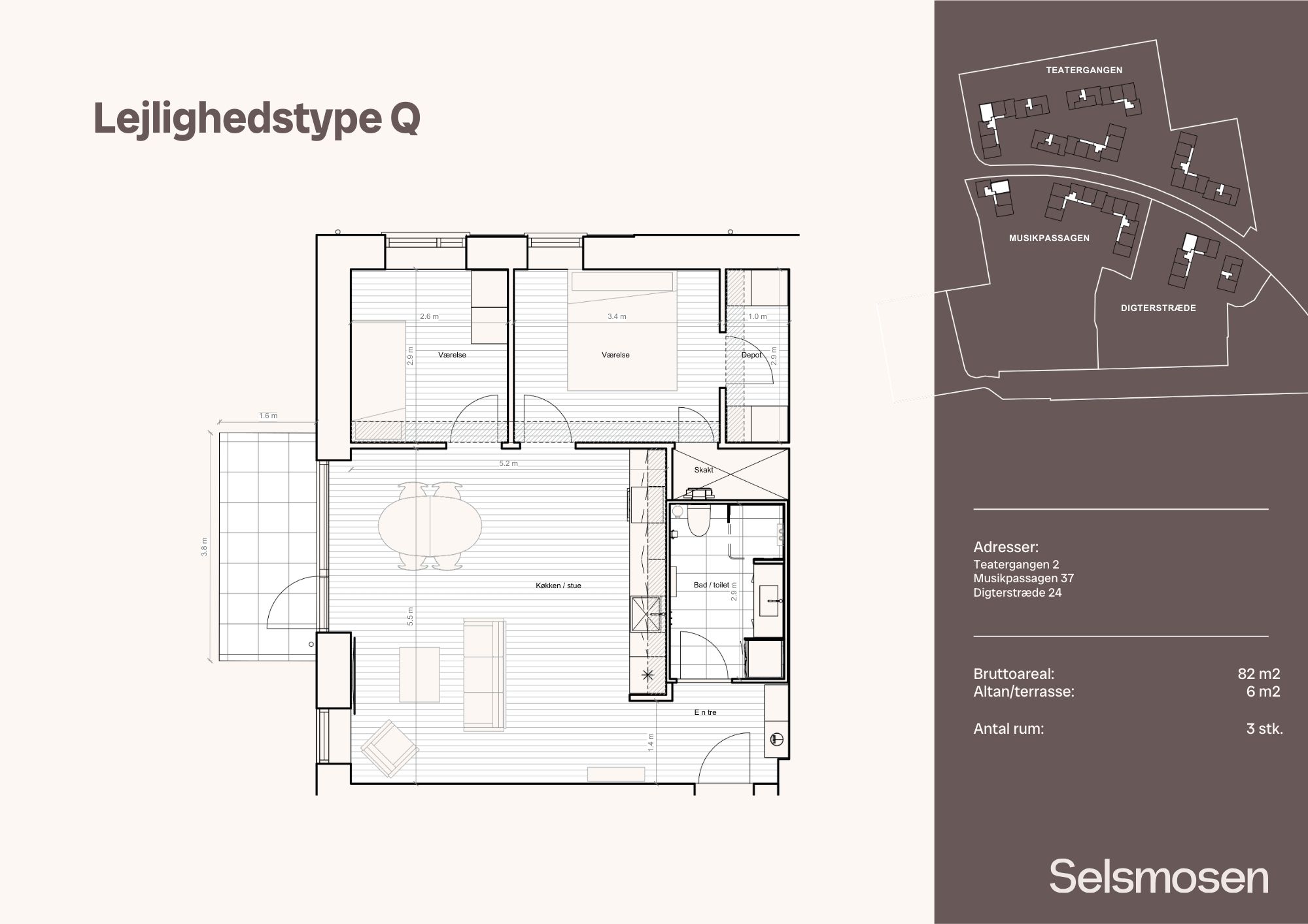 I denne 3-værelses lejlighed på 82 m² finder du to dejlige værelser, et badeværelser og et stort køkken-alrum. Fra køkken-alrummet åbner døren sig ud til en lækker terrasse, hvor sommerminder venter på at blive skabt. Boligen er opført med svanemærkede og indeklimacertificerede materialer.
