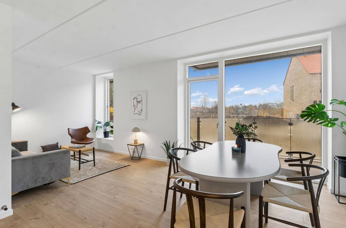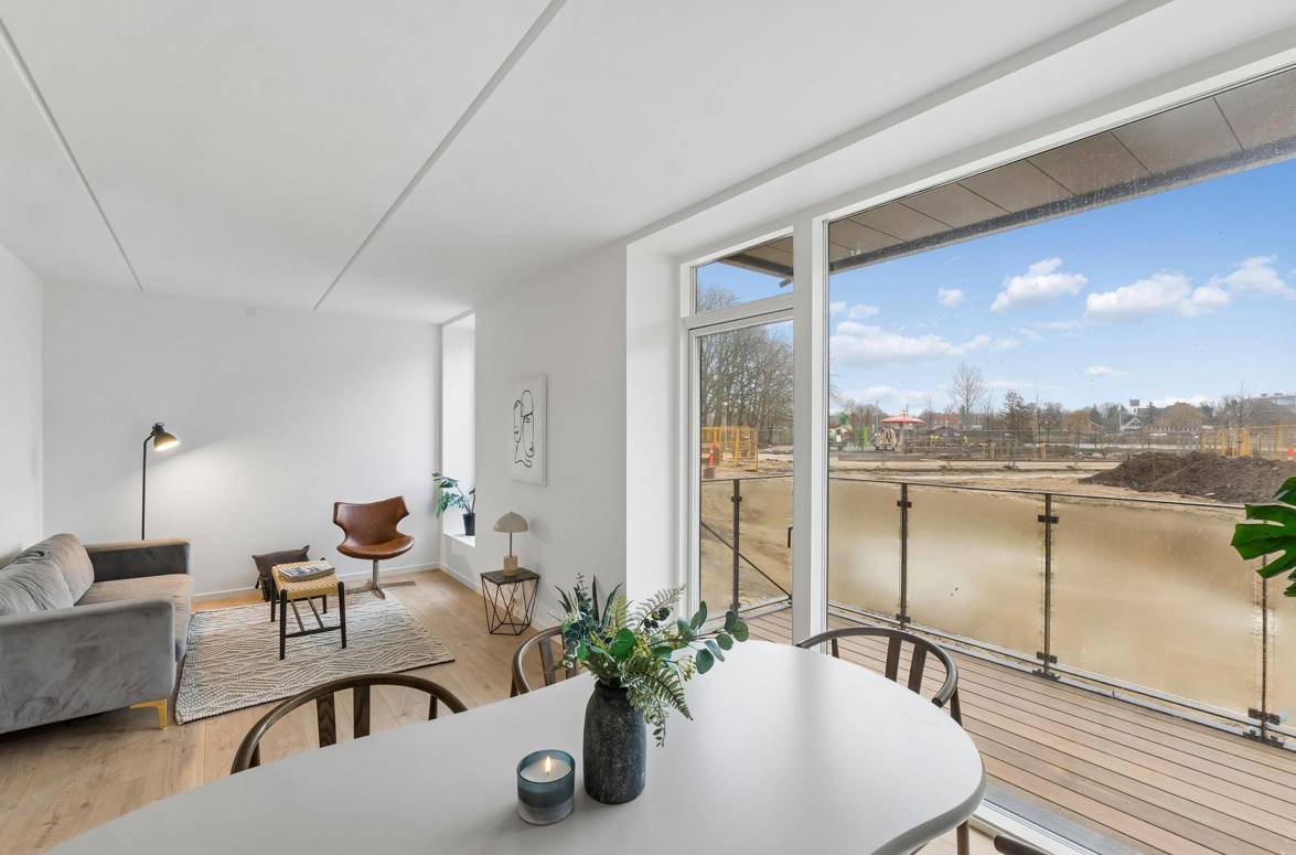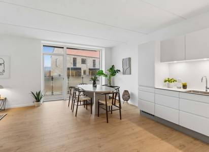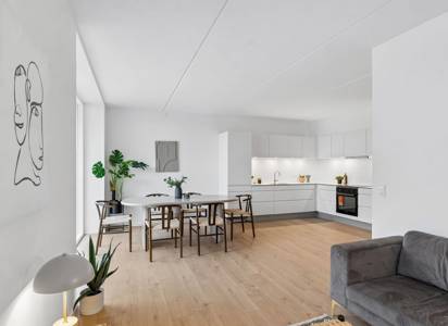 Denne 3-værelses i stuen byder på en dejlig terrasse, lækkert lysindfald, to soveværelser og et køkken-alrum, der samler hverdagen. 90 m² med stil og alt i hårde hvidevarer. Boligen er opført med svanemærkede og indeklimacertificerede materialer.