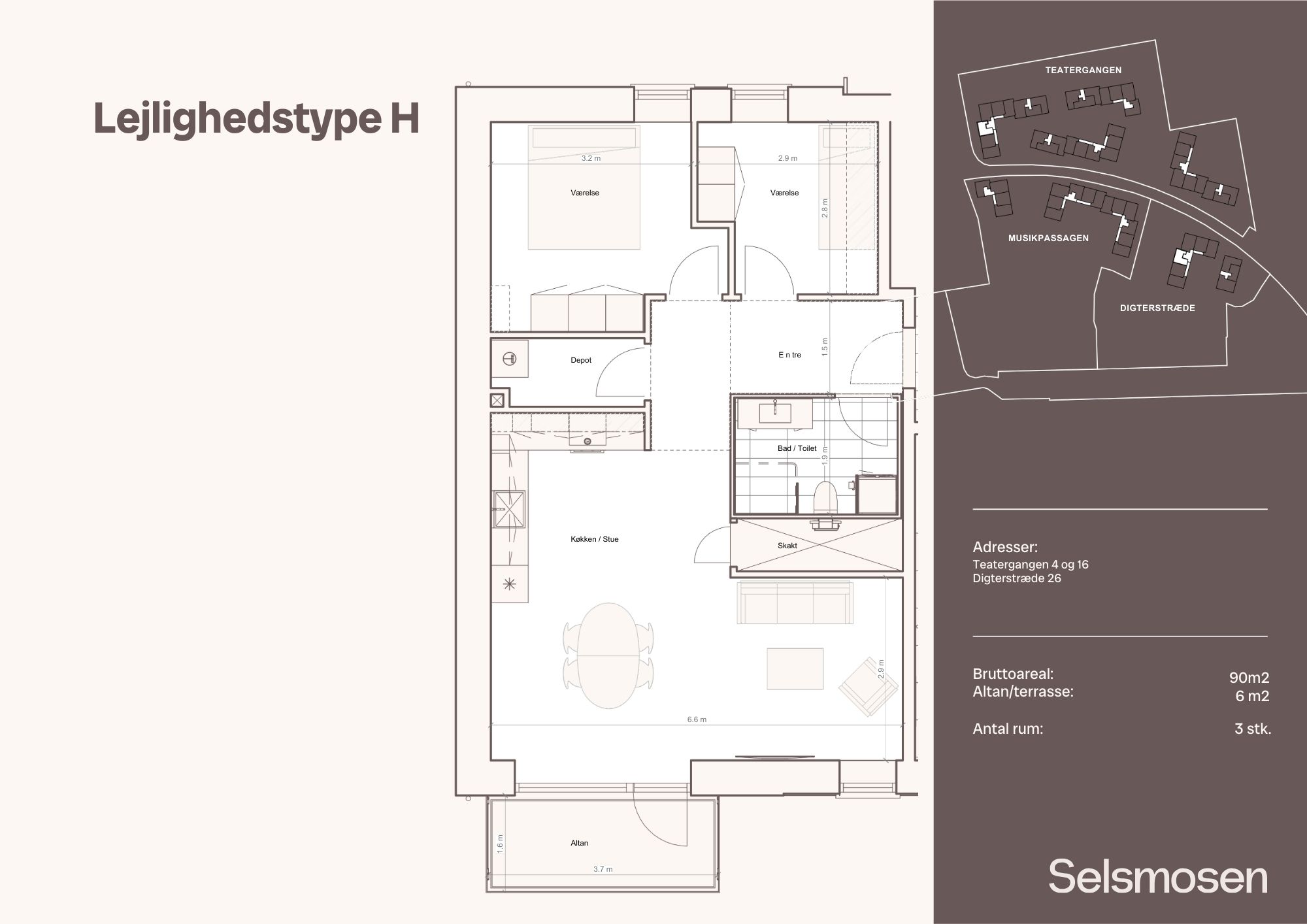 Bemærk at billederne kan være af en tilsvarende boligtype, hvorfor vi henviser til plantegningen og altid opfordrer til du oplever lejemålene ved selvsyn. Materialerne er dog de samme i alle enheder, med små variationer.